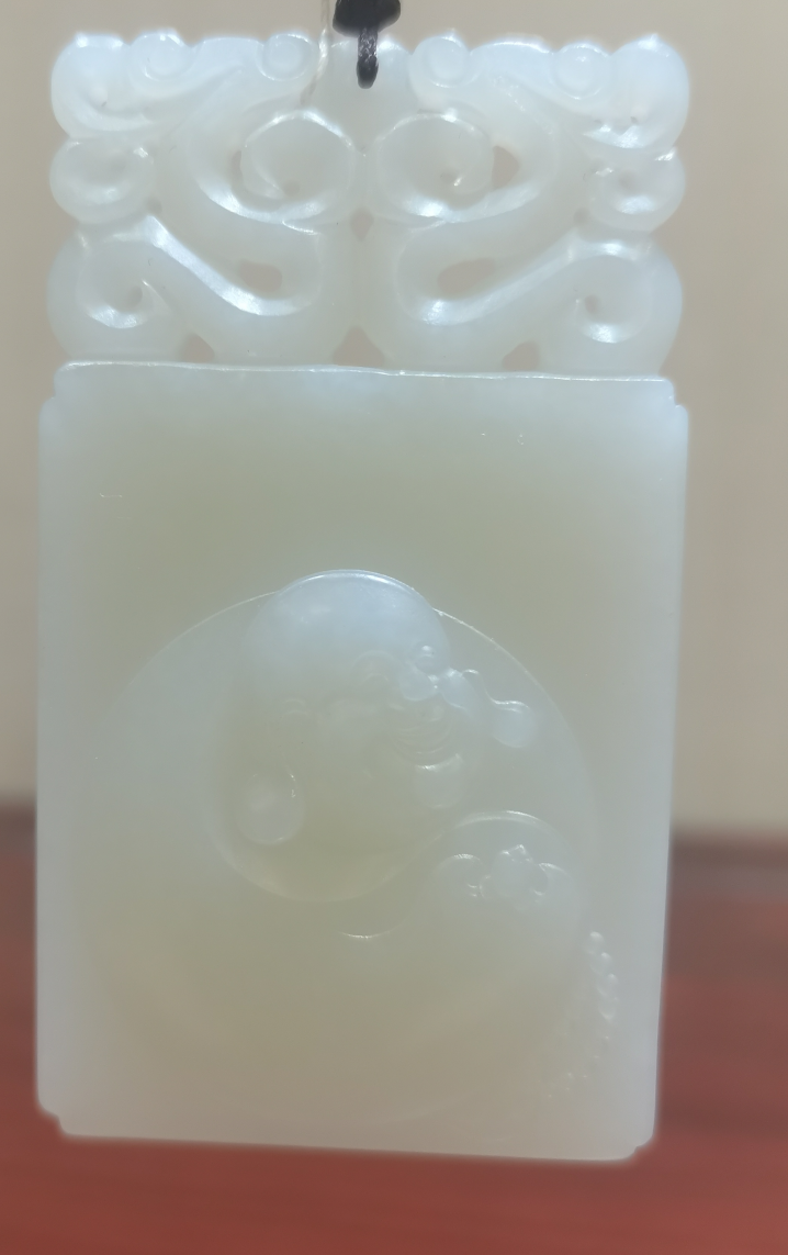 牌型工整,牌頭為二龍戲珠,是身份和財(cái)富的象征。人物神態(tài)逼真,線條輕盈柔美,雕琢細(xì)致,刻畫傳神。寓意:和睦歡喜,吉祥如意。 玉質(zhì)溫潤,玉種老熟油潤,油性佳;手感舒適,拋光精細(xì)。手中細(xì)細(xì)盤玩,溫潤雅致,上手就油的料子。彌勒佛開臉清晰,福態(tài)憨厚,身披袈裟,手持佛珠,盤腿而坐,底部雕刻蝙蝠,佛引福來。羊脂白玉,工料具佳的一件作品,乃集賞、玩、藏傳世之精品。