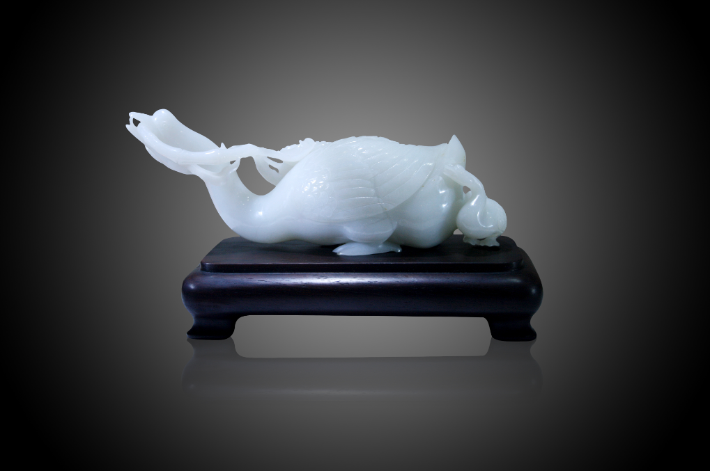 不鳴則已,一鳴驚人,故此而得名為《名甲天下》。作品通體雪白無(wú)暇、晶瑩飽滿、細(xì)膩?zhàn)虧?rùn),玉質(zhì)溫潤(rùn),色度均勻,鵝頭造型簡(jiǎn)潔大氣,鵝身厚重沉穩(wěn),呈挺胸伏臥狀,神韻兼?zhèn)?,極具感染力。整體紋飾簡(jiǎn)潔形象,雕工質(zhì)樸而不失精美。為饋贈(zèng)收藏、賞玩怡情的佳品。
