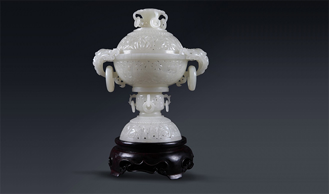 玉質(zhì)潤白細(xì)糯、晶瑩飽滿、料大難得,細(xì)膩滋潤如羊脂,通透如瑩瑩白雪。整體以立體鏤雕為主,刀法精細(xì),隨形施藝,惟妙惟肖的圓巧妙融入其中,構(gòu)成香薰?fàn)t吉祥圓滿的視覺效果。雙耳如意設(shè)計,體形弧曲圓渾,弧度對稱自然,雙耳鏤空懸掛圓環(huán),清潤富貴中包含著古樸雅致之情。作品將玉堅潤不渝的美德與如意的吉祥寓意結(jié)合,與中國文化高度契合,不僅極具美感,更傳遞出富貴吉祥、福氣安康、財運連綿、節(jié)節(jié)高升等美好祝福。