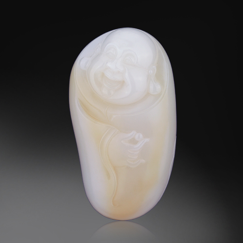 圓雕彌勒佛坐像,喜笑顏開(kāi),袒胸露腹,憨態(tài)可掬。佛是玉雕中常用的傳統(tǒng)題材,彌勒佛以大肚、大笑為形象,代表了人們對(duì)寬容、和善、幸福的向往。“笑指白蓮心自得,世間煩惱是浮云。佛是一種信仰,更是一種力量,“佛在心中”寓意佛佑平安,吉祥如意,時(shí)來(lái)運(yùn)轉(zhuǎn),福壽安康。