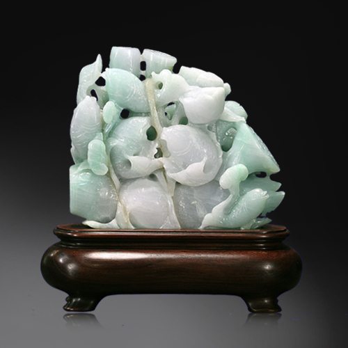 作品構(gòu)思巧妙,運(yùn)用圓雕、浮雕、俏色雕,采用寫實手法,鯉魚躍然而起于荷葉之間,極具動感,工藝細(xì)膩,構(gòu)圖完整,分色清楚,形象生動,美觀逼真,喜慶之意呼之欲出。 “魚”與“余”諧音,象征吉慶有余、連年有余。