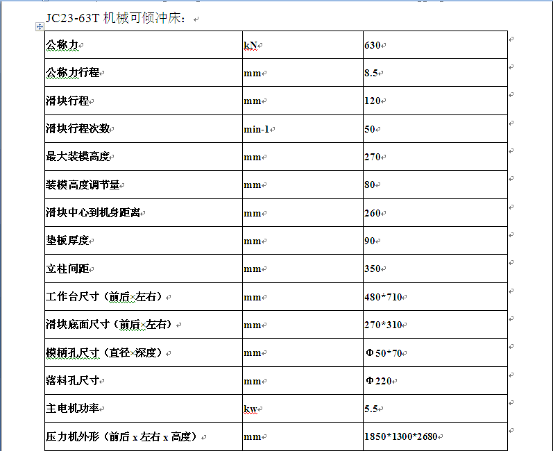 JC23-63T可傾沖床壓力機技術參數(shù)